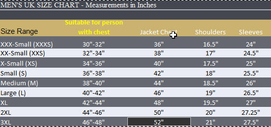 Wenn Sie sich für eine maßgeschneiderte Jacke entscheiden, senden Sie uns bitte Ihre Maße per E-Mail. Wir berechnen zusätzliche £ 20 für Größen über 2XL und Sonderanfertigungen. Die folgenden Maße sind nur für Sonderanfertigungen erforderlich. Bitte geben Sie den Brustumfang oder das dünne T-Shirt an. Hals - (Messen Sie Ihren Halsumfang auf der Höhe, wo Ihr Kragen wäre, wenn er zugeknöpft wäre. Das Maßband sollte bequem auf der Haut aufliegen und genügend Platz bieten, damit Sie sich nicht eingeengt fühlen.) Brust - (Messen Sie den Brust- und Körperumfang an der breitesten Stelle, normalerweise direkt unter den Achseln und Schulterblättern, direkt über den Brustwarzen) Schulter – (Messen Sie vom Ende der rechten Schulter bis zum Ende der linken Schulter hinter dem Nacken. Wir definieren das „Ende der Schulter“ als den Punkt, an dem die horizontale Ebene der Schulter die vertikale Ebene des Arms schneidet.) Ärmel – (vom Ende der Schulter bis zur Mitte der Handfläche) Bizeps – (Messen Sie den Umfang an der breitesten Stelle des Bizeps mit ausgestreckten Armen.) Taille/Bauch – (Messen Sie den Umfang an der breitesten Stelle Ihrer Taille/Ihres Bauchs oder direkt unter Ihren unteren Rippen, je nachdem, welcher Umfang größer ist.) Hüfte/Gesäß – (Messen Sie den Umfang an der breitesten Stelle Ihrer Hüfte und Ihres Gesäßes) Länge – (von der Kragenbasis bis zum unteren Ende der Jacke) |