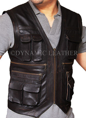 New Mens Real Leather motorcycle Vest Black Distress Leather Biker Vest
