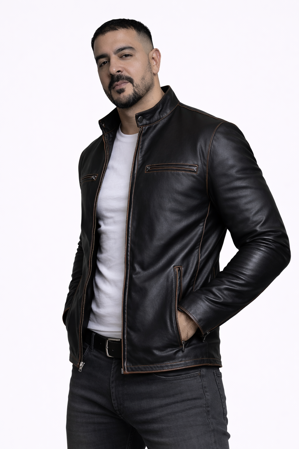 This Men's New Distressed Black Vintage Look The biker leather jacket provides a timeless piece of style. Crafted from genuine sheepskin leather, the jacket features a classic vintage style with diamond distressed detailing. Its tailored fit ensures a comfortable and stylish look.