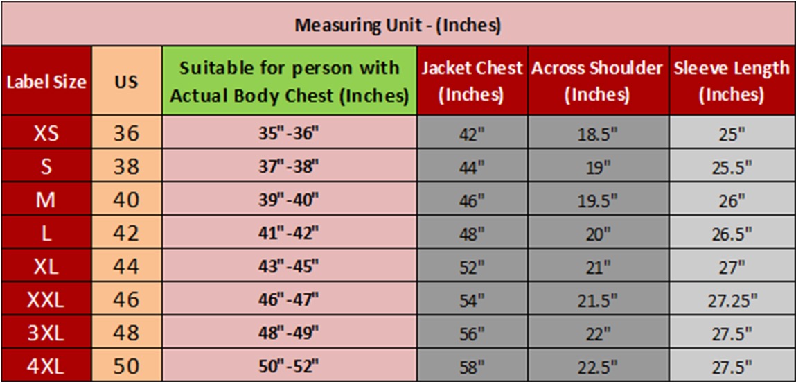 - Our QC checks each and every item thoroughly before shipping it out to the customer so it is rarely possible that you may found any issue other then sizing. Therefore we suggest our customer to choose at-least 4-6 inches larger jacket chest with respect to their own chest size.