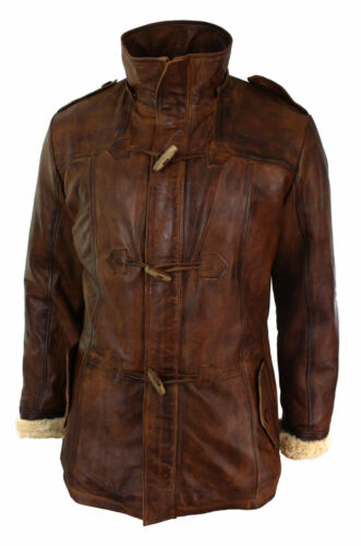 New Men's 3/4 Long Real Leather Duffle Jacket Coat Safari Detachable Hood
