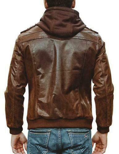 Mens Biker Vintage Brown Motorcycle Cafe Racer Real Leather Detach Hood Jacket