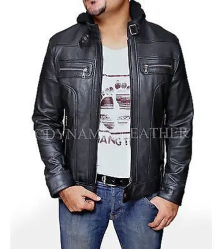 Men's Brando Double Zip Slim Fit Genuine Leather Jacket with Detachable Hood