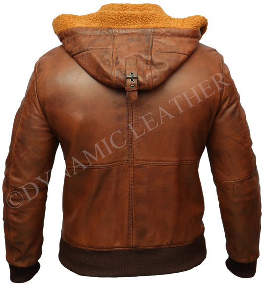 Mens Retro Brown Hooded Fur Real Leather Bomber Jacket