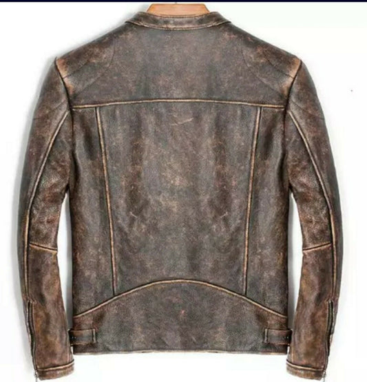 New Men's British Vintage Cowhide Antique Distressed Brown Cafe Racer Leather Jacket